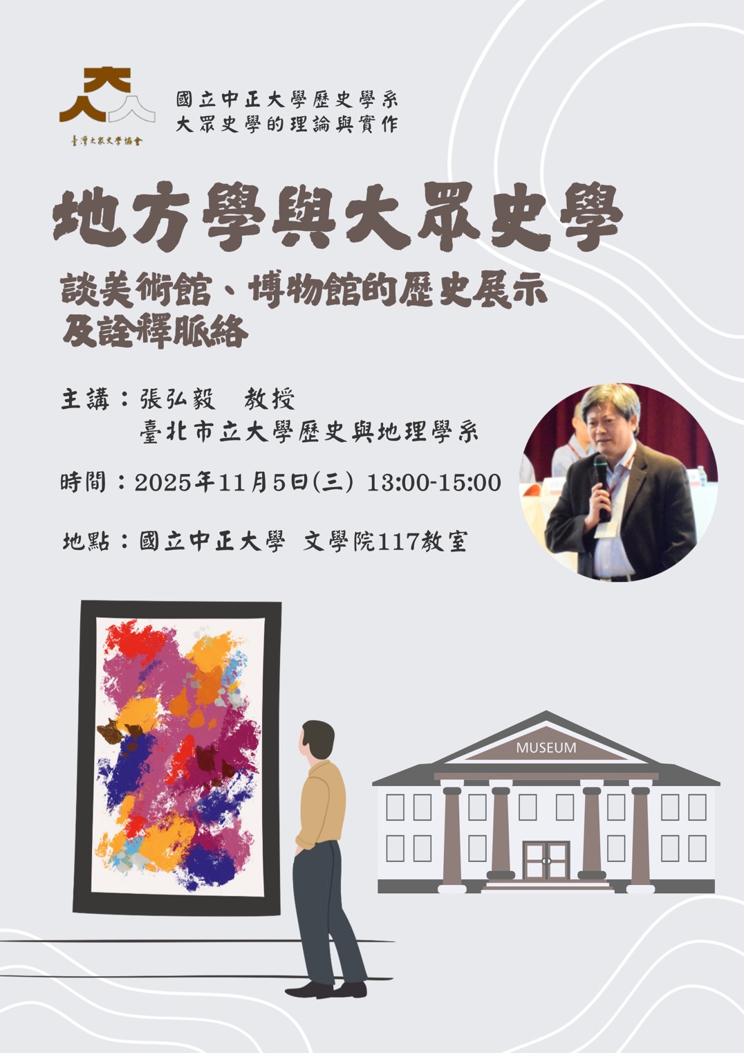 【學術演講】114/11/5臺北市立大學歷史與地理學系張弘毅教授「地方學與大眾史學:談美術館、博物館的歷史展示及詮釋脈絡」專題演講