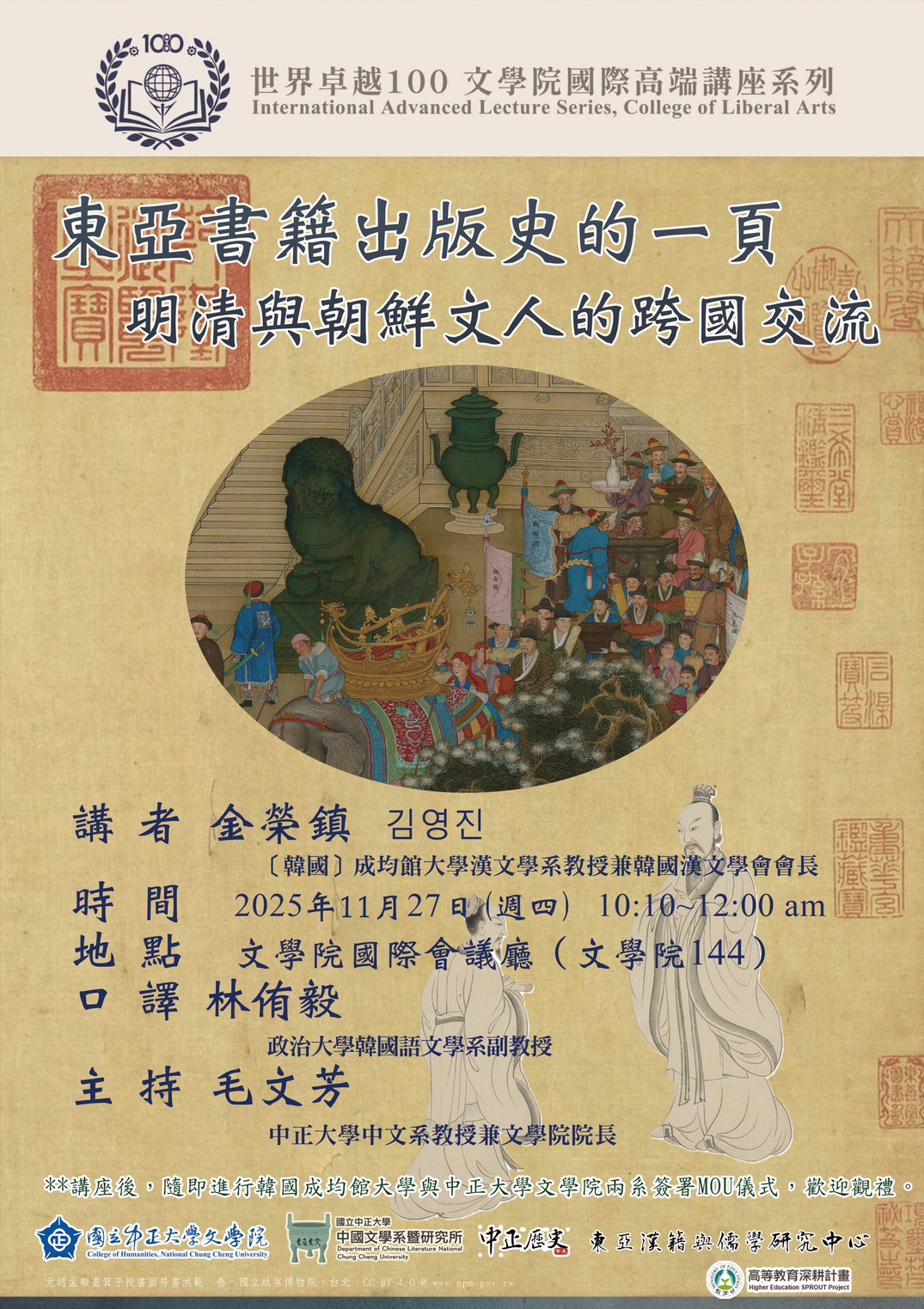 [世界卓越一百國際高端講座] 講 者:金榮鎮김영진 [韓國]成均館大學漢文學系教授兼韓國漢文學會會長 題 目:東亞書籍出版史的一頁——明清與朝鮮文人的跨國交流 時 間:2025年11月27日(周四)10:10~12:00 地 點:文學院國際會議廳文144 口 譯:林侑毅 政治大學韓國語文學系副教授 主持人:毛文芳 中正大學中文系教授兼文學院院長 ۞講座後,隨即進行簽署MOU儀式,由韓國成均館大學與 本校文學院中文、歷史兩系共同簽署,歡迎觀禮。 合辦:中正大學文學院、中文系、歷史系、東亞漢籍與儒學研究中心