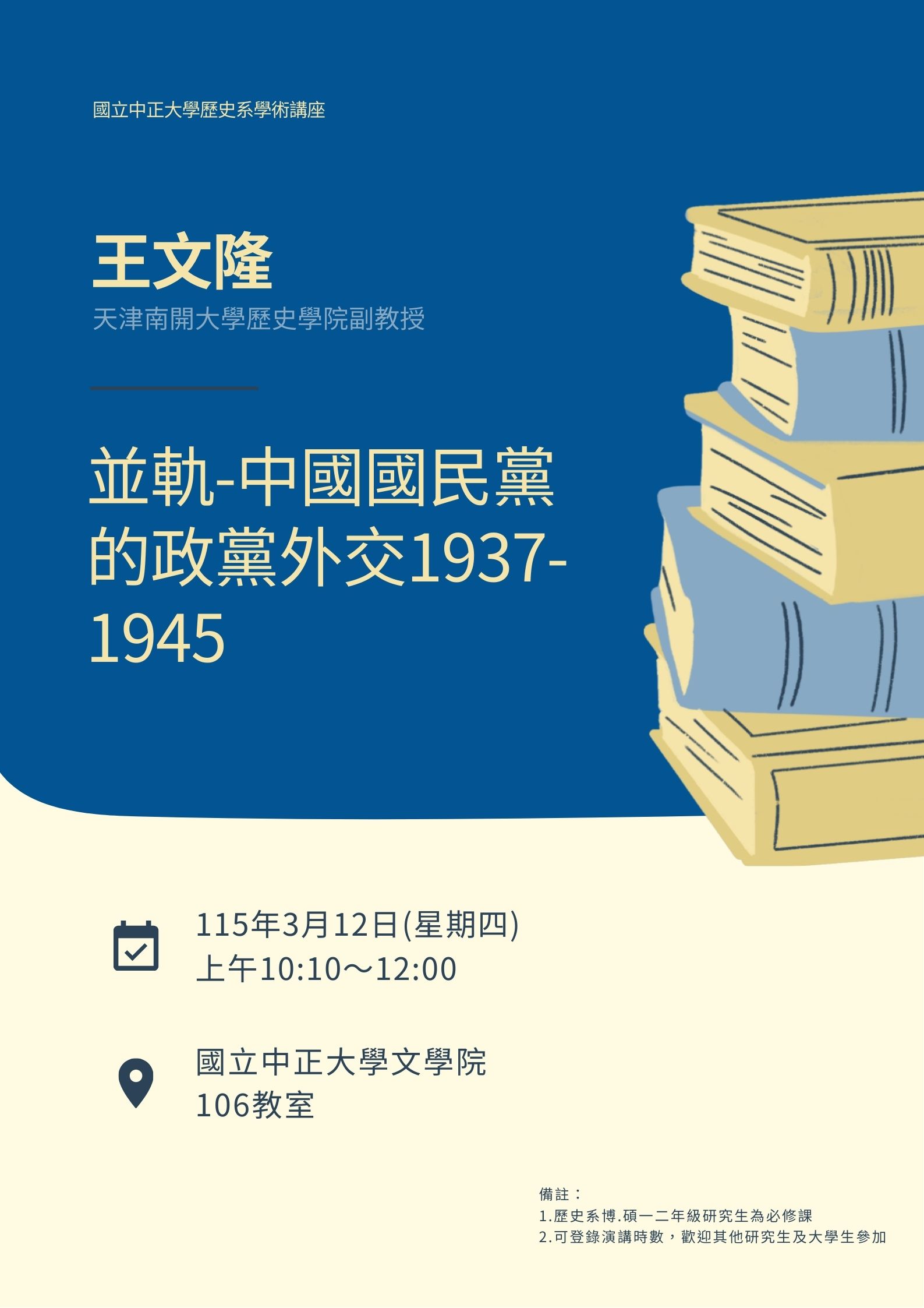 【學術演講】115/3/12天津南開大學歷史學院王文隆副教授「並軌-中國國民黨的政黨外交1937-1945」專題演講